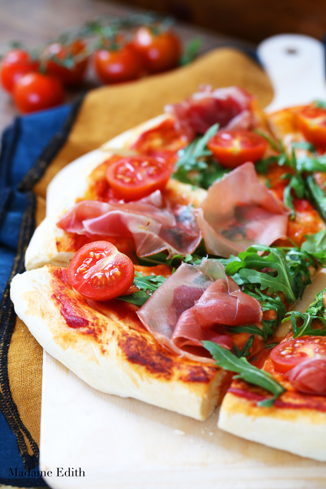 Na pizzę wykładamy składniki, które dodaje się po pieczeniu: pomidorki, rukolę i szynkę dojrzewającą. Całość można skropić oliwą.