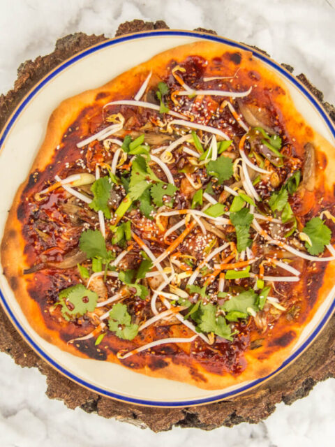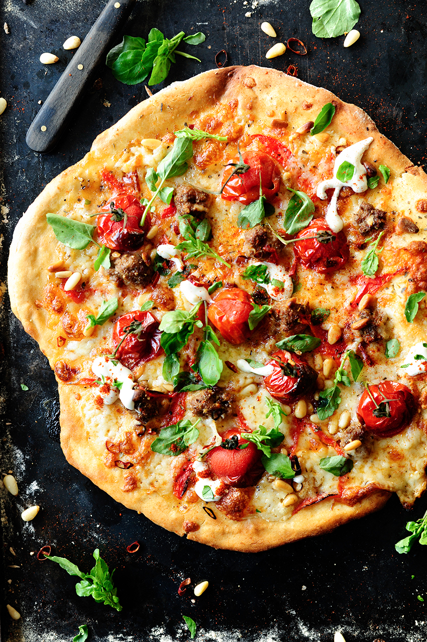 Pizzę podać posypaną pestkami granatu i z sosem czosnkowym. Smacznego!