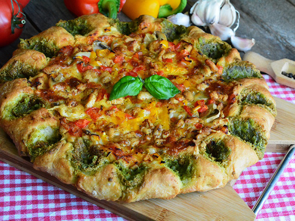 Ciasto Drożdże pokruszyć, dodać cukier, wlać wodę, dokładnie wymieszać do całkowitego rozpuszczenia drożdży. Odstawić na około 20minut. Po tym czasie dodać przesianą mąkę, oliwę i sól. Ciasto dobrze wyrobić, przełożyć do miski, przykryć ściereczką i odstawić do wyrośnięcia. Następnie wyrośnięte ciasta uformować na kształt pizzy i przełożyć do formy o średnicy 36cm wysmarowanej oliwą. Na brzegach uformować zagłębienia do wypełnienia pesto.
