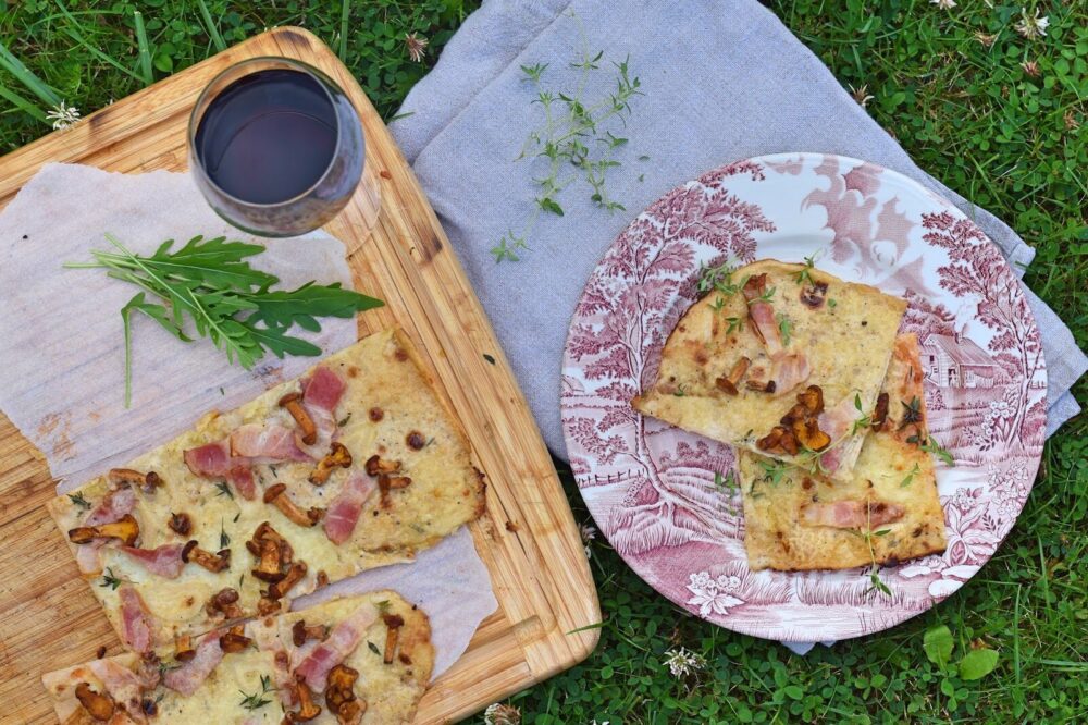 Ciasto rozkładam na wysypanym mąką blacie i delikatnie rozciągam. Następnie wykładam na wysmarowaną oliwą blachę i rozciągam na brzegi blachy. Smaruję białym sosem i układam składniki. W pierwszej kolejności startą na tarce mozzarellę, następnie oczyszczone kurki, boczek pocięty w cienkie paski, posypuję cebulą i połową listków tymianku. Wkładam do piekarnika nagrzanego do 300 stopni i piekę 5 min. Wyciągam, kroję i posypuję resztą tymianku. Najbardziej lubię polewać oliwą i delikatną ilością octu.