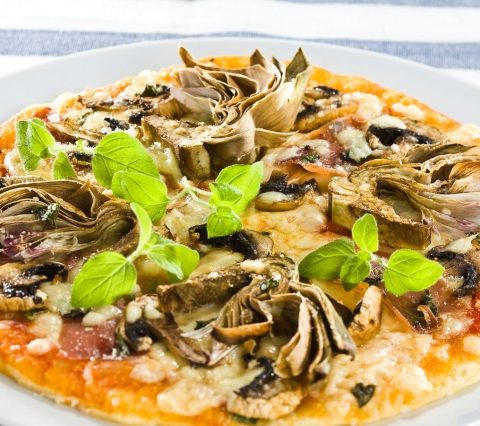 Na ciasto wykładamy ser, a następnie warzywa, posypujemy startym parmezanem na wierzch układamy szynkę. Pieczemy w 210 stopniach C na najniższym poziomie przez 15 minut. Wierzch upieczonej pizzy obficie posypujemy rukolą.