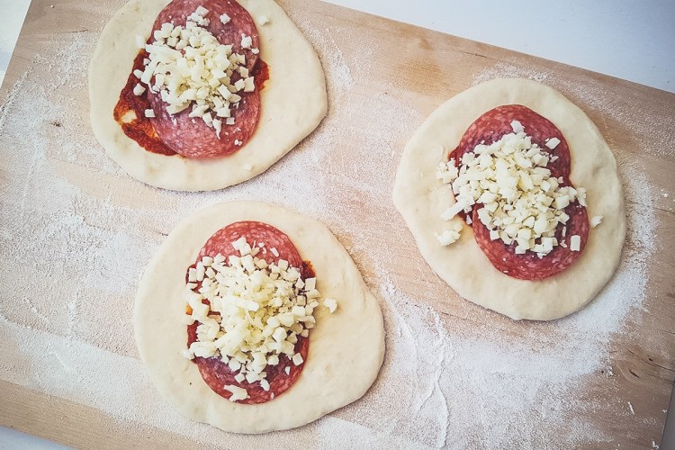 - Gotowe placki smarujemy sosem pomidorowym, nakładamy salami, ser mozzarella i szczelnie zamykamy.
