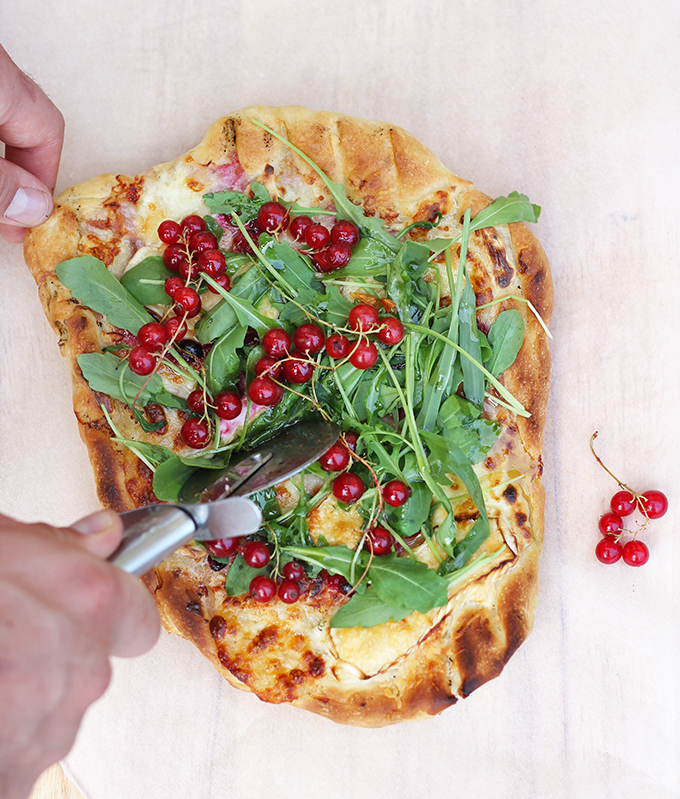 - Pizzę dekorujemy rukolą i świeżą porzeczką.